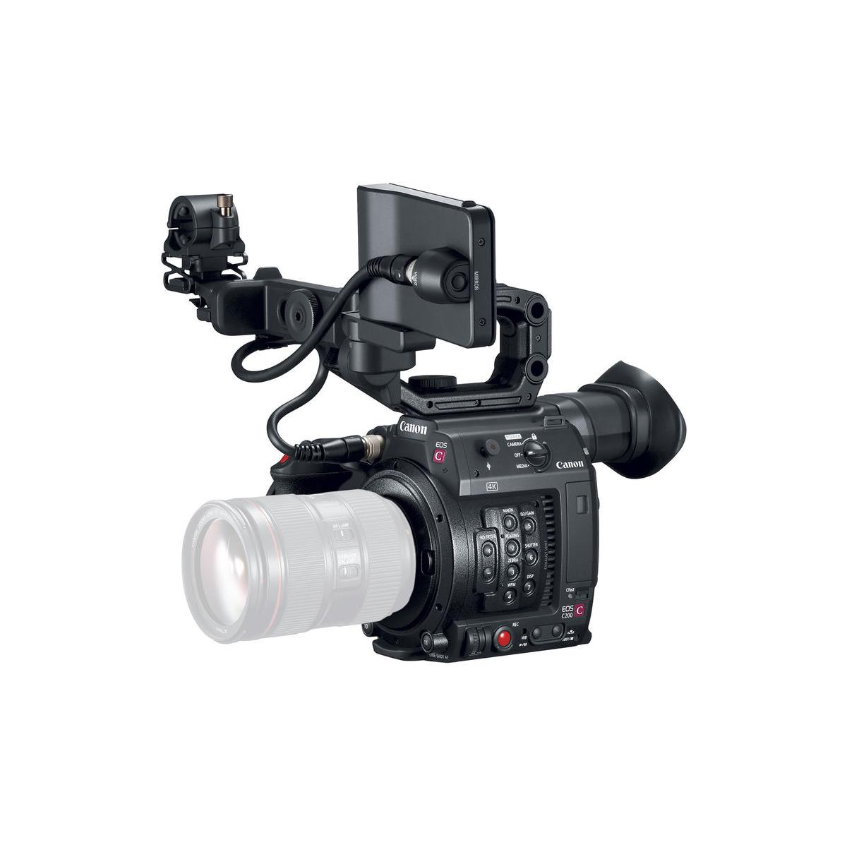 The EOS C200 Digital Cinema Camera features a built-in 1.77-million dot, 0.46-inch Electronic Viewfinder and a detachable and adjustable 1.23-million dot, 4-inch LCD Monitor with touchscreen capabilities (LM-V1). These components enable more convenient and flexible monitoring while shooting and allow you to instantly view previously captured media. The touchscreen display provides quick and easy access to menu options and camera controls, and enables fast focusing with a single tap of a finger.