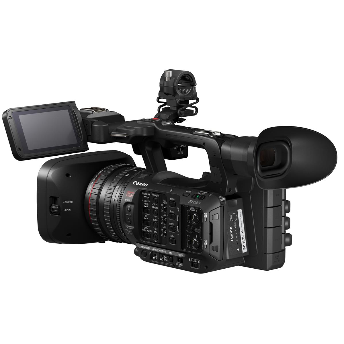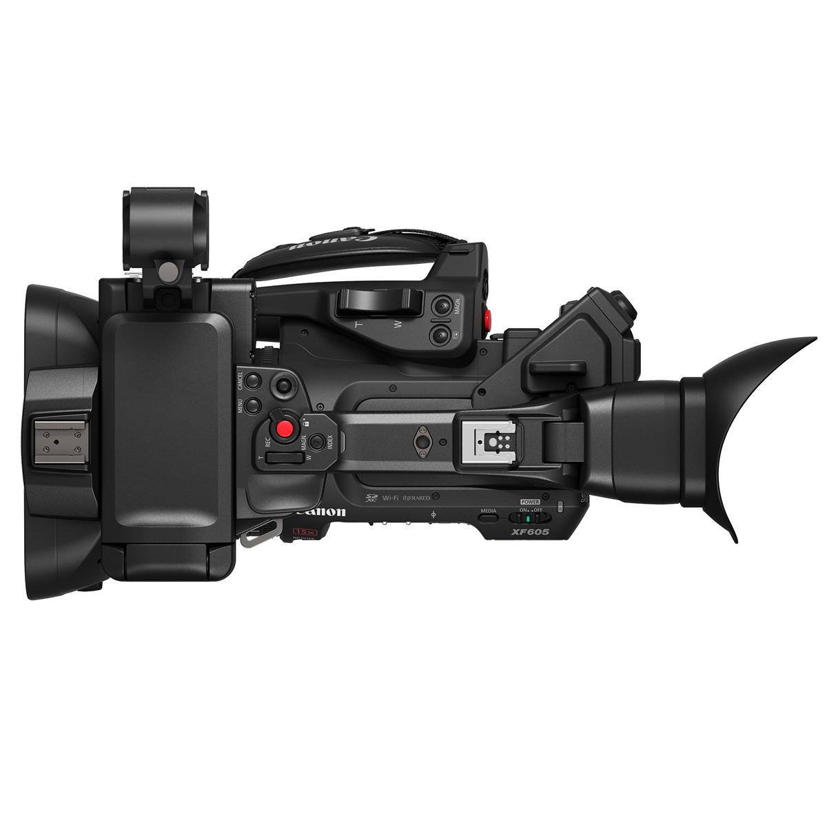 XF605 features a Multi-Function Shoe that is compatible with a new XLR microphone adapter (developed by TEAC Corporation) for increasing the total number of XLR inputs to 4, providing a flexible audio recording workflow. The camera features built-in Wi-Fi/Ethernet for Browser Remote, CTM (Content Transfer Mobile) app, IP streaming, and FTP transfer. The camera is also the first XF-series camera to feature USB Video Class allowing use as a webcam without the need for a 3rd Party HDMI to USB adapter.